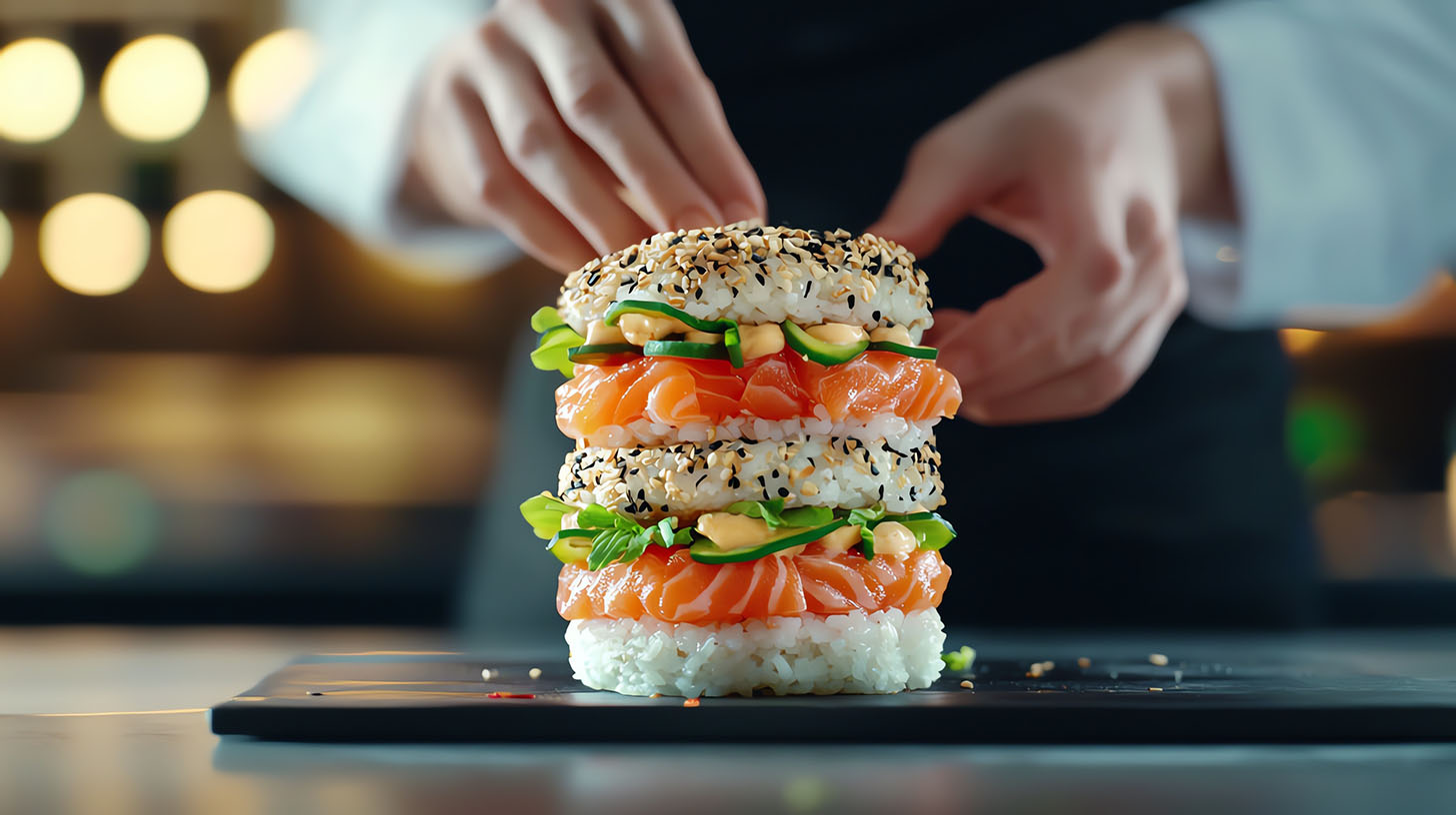 A sushi burger is a unique fusion dish that brings together elements of traditional sushi with the structure of a burger. Unlike a typical burger, the "buns" in a sushi burger are made from compacted sushi rice, which is often shaped into a round, bun-like form. Sometimes, these rice buns are lightly seared or toasted to add a bit of texture, giving them a slight crisp on the outside while remaining soft on the inside.